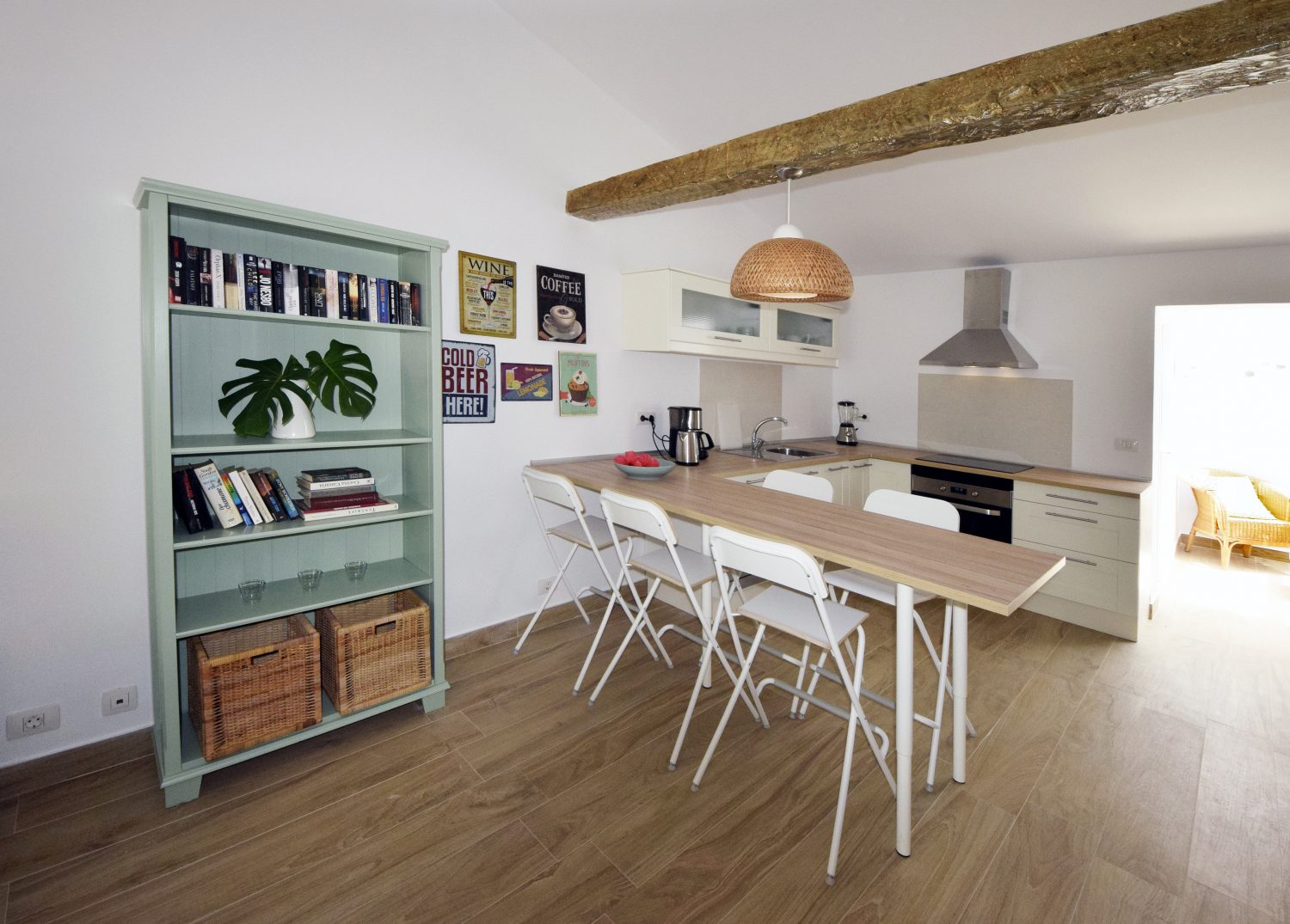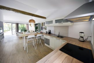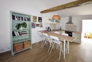 An open, practical kitchen including microwave, refrigerator, freezer. toaster, coffee machine, boiling kettle, oven, relevant cutlery and glassware. The kitchen table has high stools to enjoy breakfast in an informal atmophere (also useful to work at with a laptop).